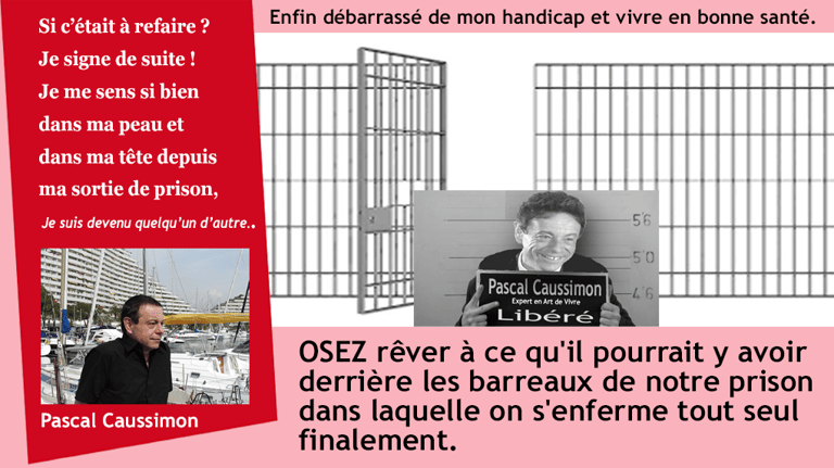 J'ai appris durant mes 39 années d'incarcération qu’il est possible de se métamorphoser à tout moment de notre existence. N'en doutez pas un seul instant. Vraiment ! Cette transformation tient en un seul mot : OSER. OSEZ changer ! OSEZ rêver à ce qu'il pourrait y avoir derrière les barreaux de notre prison dans laquelle on s'enferme tout seul finalement. La vérité, c'est que nous n'osons pas changer soit par peur, soit par manque de connaissance et parfois soit par manque de confiance. Pourtant, nous avons toutes et tous les moyens d'OSER mieux vivre. Aujourd'hui, j'en ai fait un Art à vivre si passionnant et je continue tous les jours d'expertiser les moindres recoins de ma nouvelle vie. Le deuxième mot qui a été déterminant pour le repris de justesse que j'ai été : PERSEVERANCE. Sans persévérance, je n'aurais pu me libérer de cette poubelle dans laquelle je survivais, croyant à tort qu'il était impossible de rêver à ce que je puisse être enfin débarrassé de mon handicap et vivre en bonne santé.